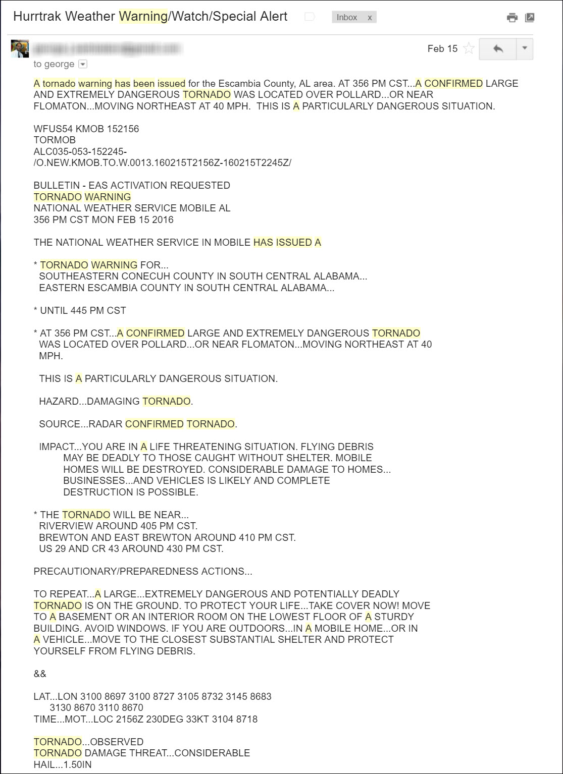 See some examples of how the weather warnings/watches are displayed as well as the types of alert messages/emails below (scroll all the way to the bottom of the page).