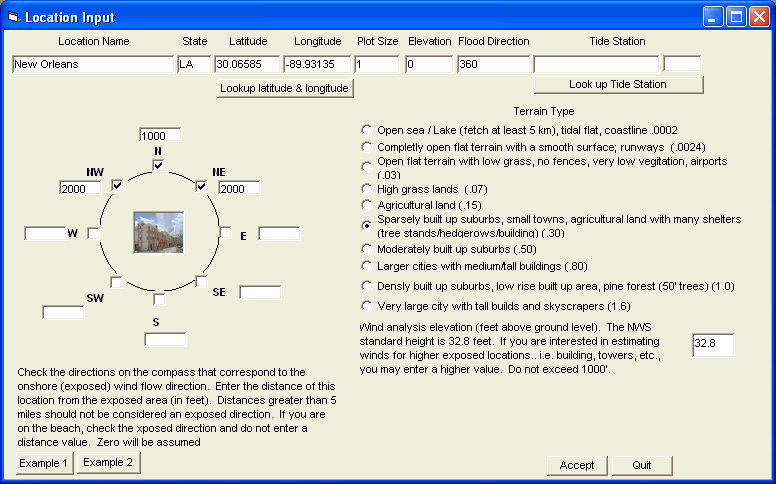 (patent pending)Advanced location wind estimation is a function of HURRTRAK RMPRO that applies a wind speed correction factor to the forecast wind speeds based on the local “site” characteristics. These characteristics include distance from open (ocean) exposures, types and density of vegetation and man made structures, and elevation being analyzed.
