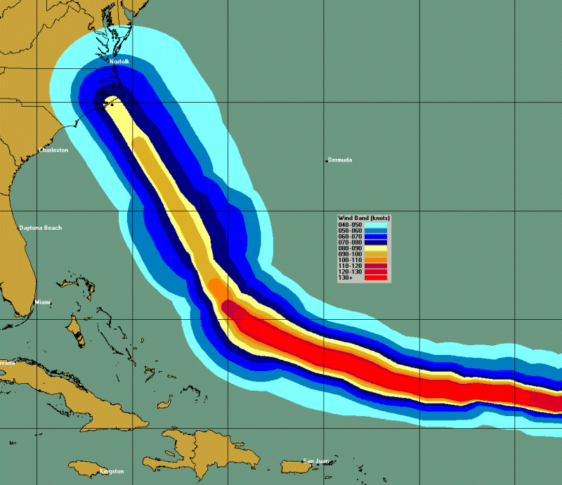 The user has the ability to display the storms past and forecast wind band analysis. The wind contour levels (up to 10 levels) and display colors are user defined. Isabel's wind bands (2003) are shown below.
