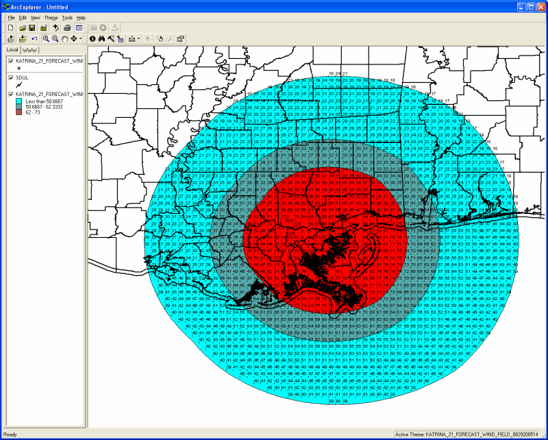 The HURRTRAK Advanced system has the ability to export several types of system outputs to an ESRI type shape file (supports point, polyline and polygon type files). The following shows the different types of data can be exported to a Shape file as well as an example of each using ArcExplorer (free application).
